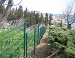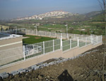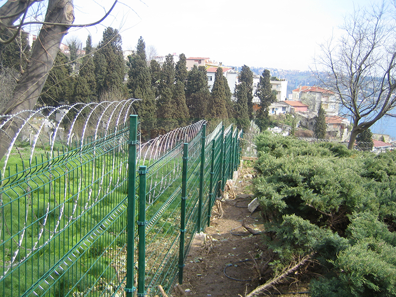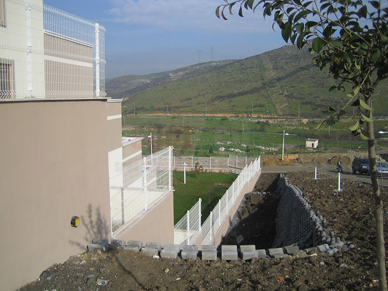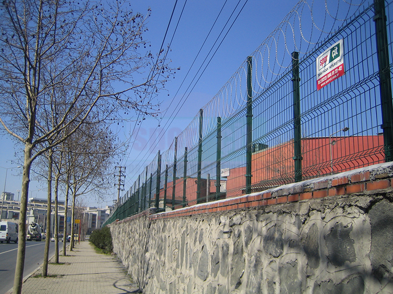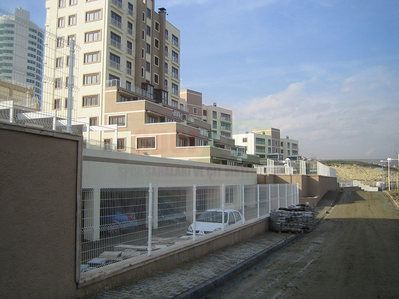 Brüt 1,50m-1,70m ve 2,00m uzunluğundaki tabanı flanş kaynaklı Y şeklindeki 60x2mm boru çit direkleri takribi 3,00m ara ile önceden betonarme perde duvar üzerine 4 adet çelik dübel yardımı monte edilecektir.Dikilen direklere 1,50m-1,70m veya 2,00m yüksekliğinde PVC kaplamalı veya galvaniz kaplamalı örgü teli monte edilir.Örgü telinin esnemesini önlemek için 3 sıra gergi teli çekilir,üst V kısma 45cm veya 60cm lik paslanmaz jiletli tel çekilerek montaj işlemi tamamlanır. Boruların üst açık kısımları özel boru kapakları ile kapatılır.